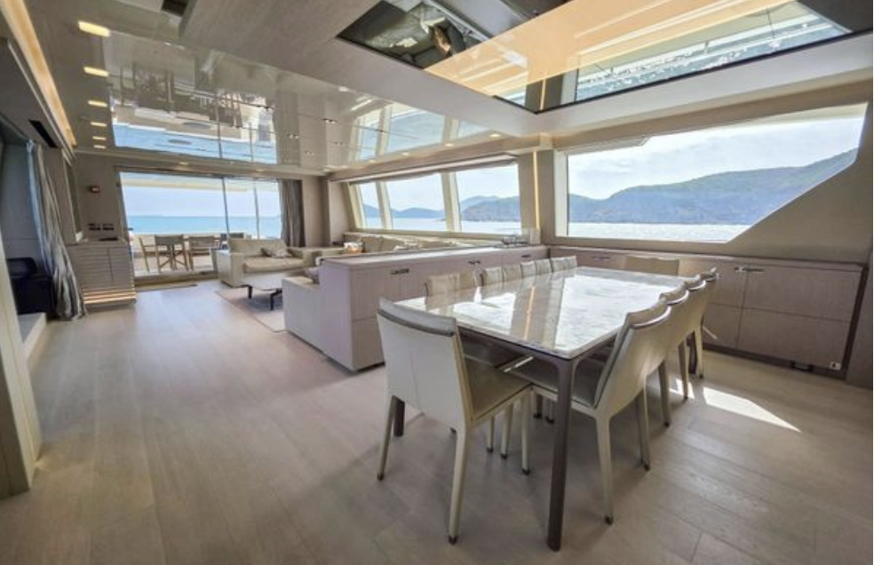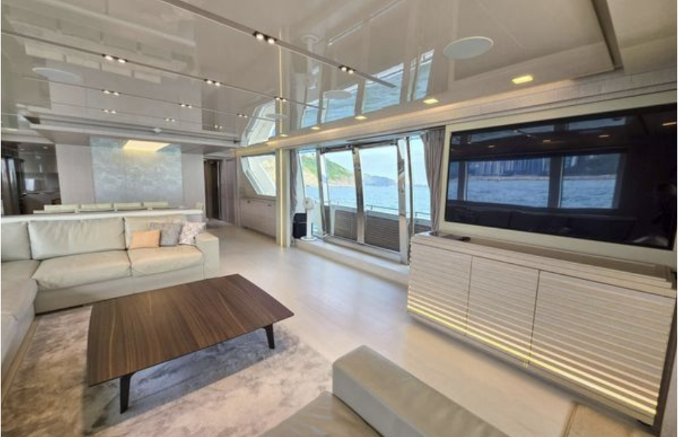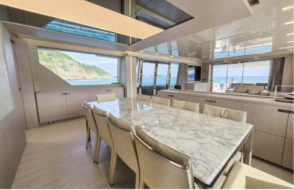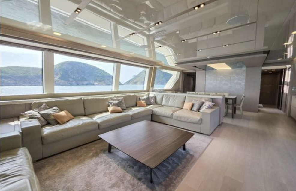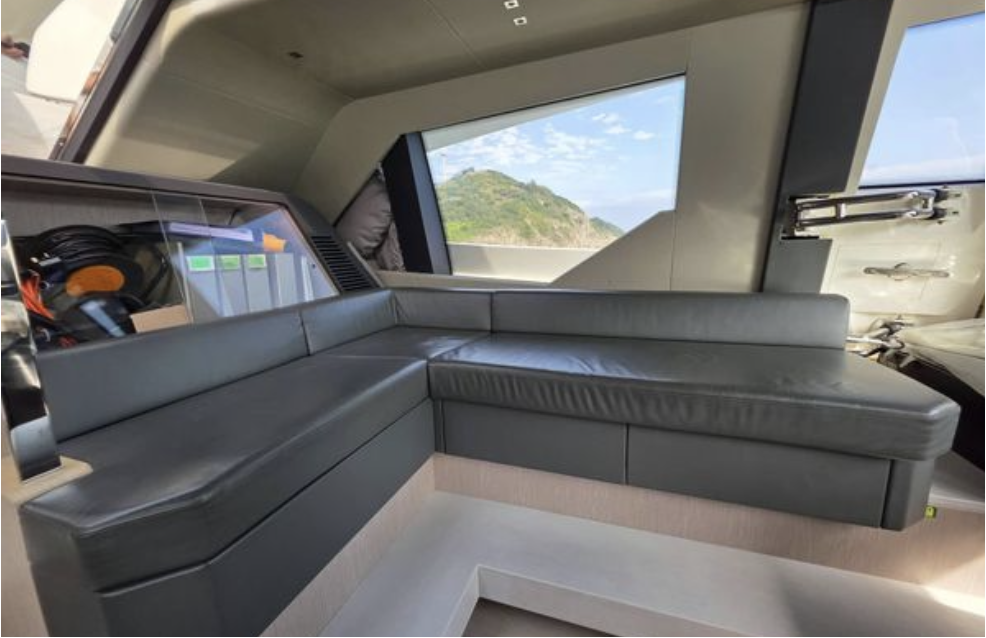 İç mekânı, tam genişlikte salon, tam donanımlı mutfak ve beş misafir kabini dahil olmak üzere ferah ve konforlu yaşam alanları sunar. Geniş panoramik pencereleri sayesinde bol doğal ışık alır. Açık alanlarıyla hem uzun seyirler hem de misafir ağırlamak için idealdir.