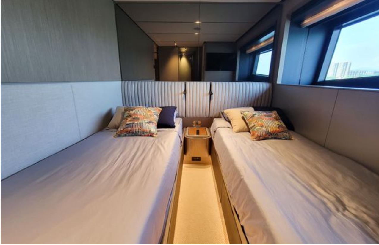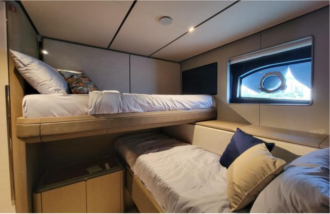 Alt güvertede, orta kısımda tam genişlikte master kabin dahil 4 konuk kabini mevcuttur. Her biri özel banyoya sahip 3 ilave kabinle toplamda 8 kişilik misafir konaklaması sunar. Mürettebat alanı 3 kişi için tasarlanmıştır.
