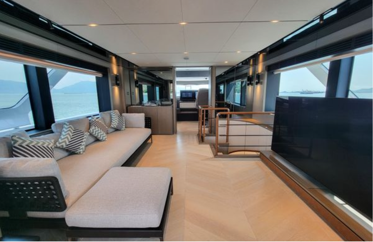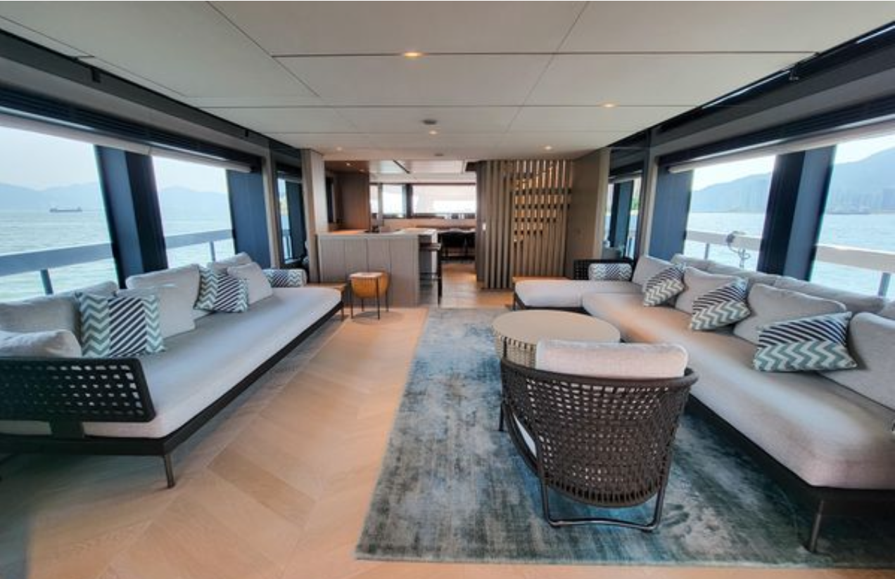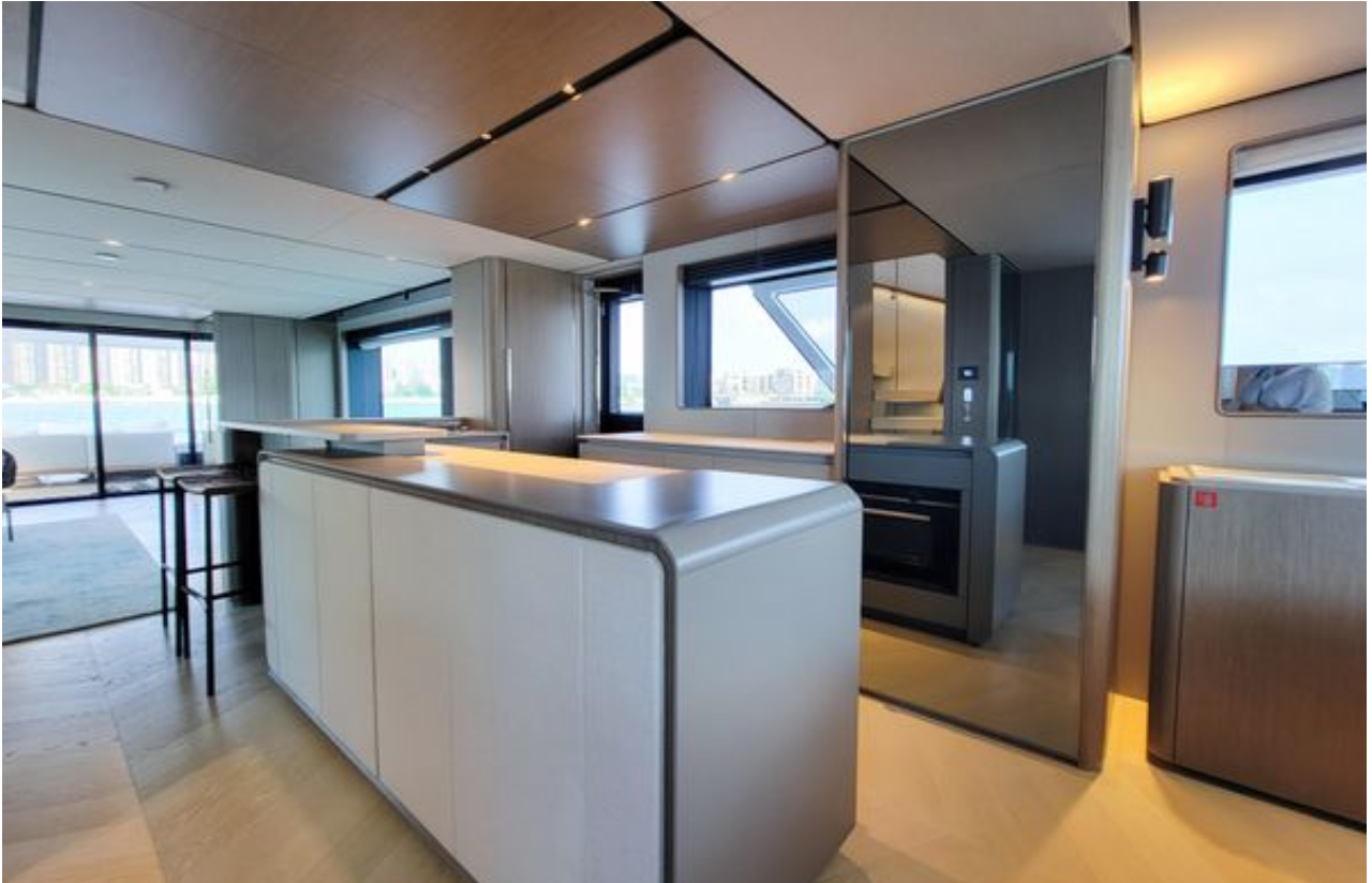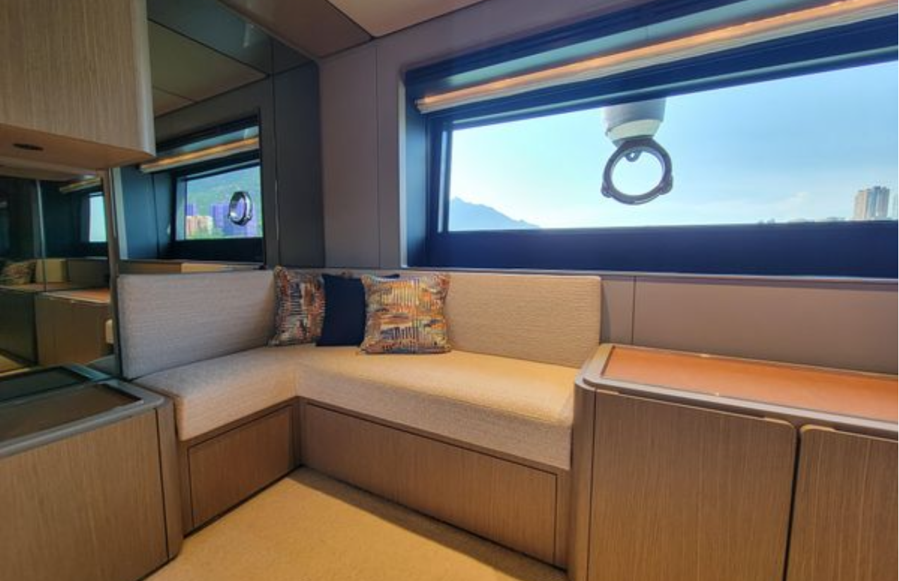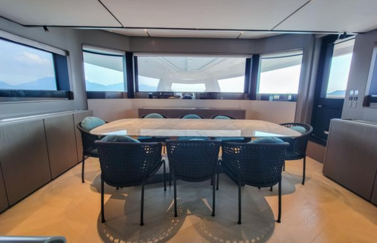 Ana güvertedeki tam açılır cam pencere sayesinde salon ve ön güverte birleşerek ferah bir yaşam alanı oluşturur. İç mekanda cam yüzeyli oval yemek masası 8 kişiyi rahatça ağırlar.